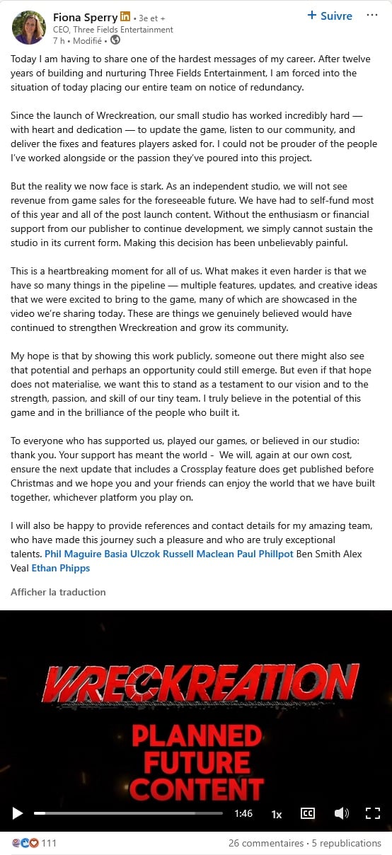 Le studio Three Fields Entertainment (Wreckreation) ne va pas bien du tout et va probablement fermer :