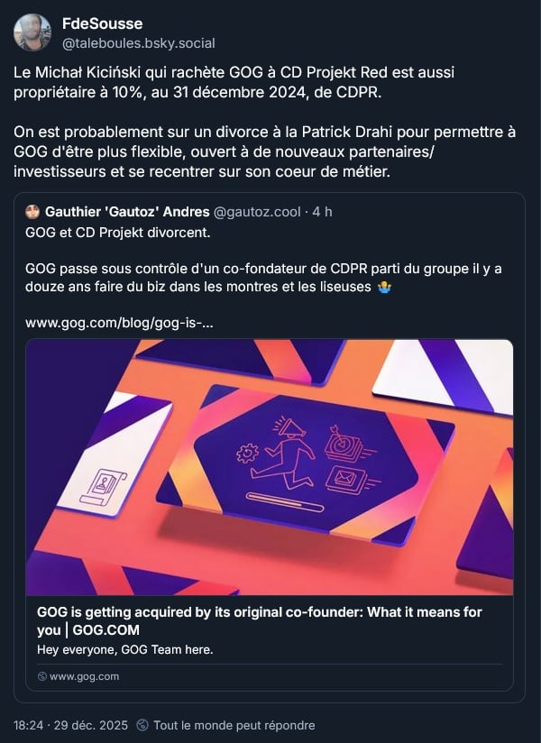 GOG est racheté par Michał Kiciński, son co-fondateur. Alors que Sol Cesto est toujours indé :