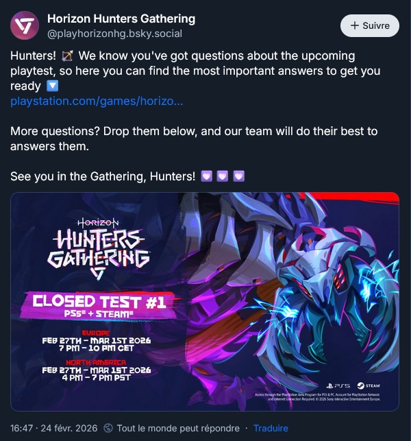Le premier playtest fermé de Horizon Hunters Gathering aura lieu du 27 Février au 1er Mars sur Steam et PS5 :