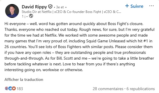Netflix ferme Boss Fight Entertainment qu’il avait acheté en Mars 2022, et licencie environ 120 personnes :