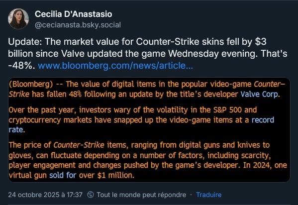 Les collectionneurs – revendeurs de skins Counter Strike 2 sont un peu fâchés de la dernière mise à jour qui permet d’obtenir des couteaux plus facilement et qui aurait, selon Bloomberg, effacé 1.75 3 milliards de dollars sur le marché des skins du jeu :