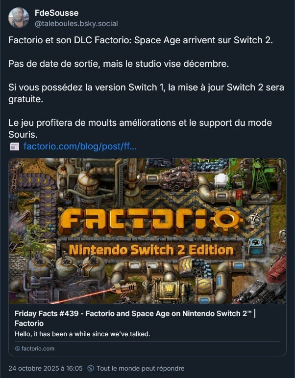 Factorio et son DLC Space Age sortent un jour prochain sur Switch 2 avec upgrade gratuite depuis la version Switch 1 :